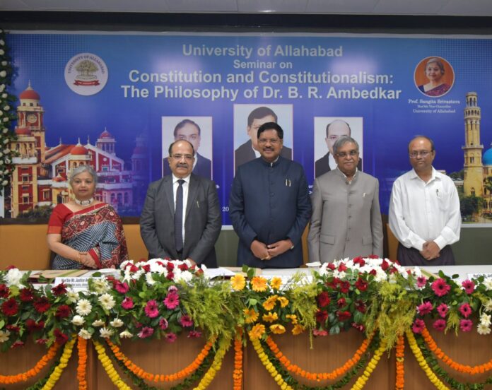 प्रयागराज। इलाहाबाद विश्वविद्यालय, प्रयागराज में शनिवार को ‘‘कांस्टीट्यूशन एंड कांस्टीट्यूशनलिज्म : द फिलोस्फी ऑफ डॉ. बी. आर. अम्बेडकर’’ विषय पर सेमिनार का आयोजन किया गया। मुख्य अतिथि भारत के सर्वोच्च न्यायालय के माननीय मुख्य न्यायाधीश न्यायमूर्ति बी.आर. गवई, सुप्रीम कोर्ट के वरिष्ठ माननीय न्यायाधीश न्यायमूर्ति विक्रम नाथ, इलाहाबाद उच्च न्यायालय के माननीय मुख्य न्यायाधीश न्यायमूर्ति अरूण भंसाली और इविवि की कुलपति प्रो. संगीता श्रीवास्तव ने दीप प्रज्ज्वलित कर कार्यक्रम की शुरूआत की। इविवि की 15 यूपी एनसीसी बटालियन ने अतिथियों को गार्ड आफ ऑनर दिया। इसके बाद विश्वविद्यालय का कुलगीत प्रस्तुत किया गया। सेमिनार में मुख्य न्यायाधीश न्यायमूर्ति बी.आर. गवई को सम्मानपत्र प्रदान किया गया।